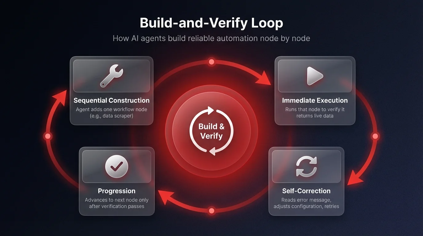 - Self-correction: If the node fails, the agent reads the error message, adjusts the configuration, and tries again.