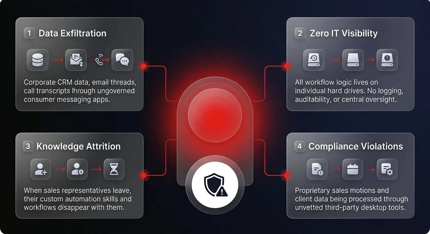 While the productivity gains are staggering, this decentralized approach to AI introduces severe operational and security challenges for enterprise leaders. By understanding these five transformative sales workflows currently being deployed on local machines, operations leaders can better strategize how to centralize, govern, and deploy these capabilities securely at scale. As we detailed in desktop AI agents and the broader governance crisis, ungoverned desktop automations are quickly becoming one of the most significant risks facing mid-market companies.