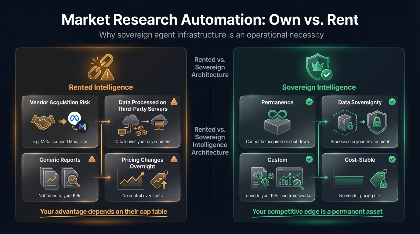 Market research automation is the use of AI agents to gather, synthesize, and deliver competitive intelligence at consulting-grade quality — in minutes rather than weeks. For decades, deep strategic analysis required expensive engagements with firms like McKinsey or Bain. Today, specialized agents replicate that level of insight by integrating data providers like SimilarWeb with large language models. However, Meta's 2025 acquisition of agent platform Manas.im has exposed a critical vulnerability: organizations that build strategic infrastructure on rented tools face sudden disruption when vendors pivot or get acquired.