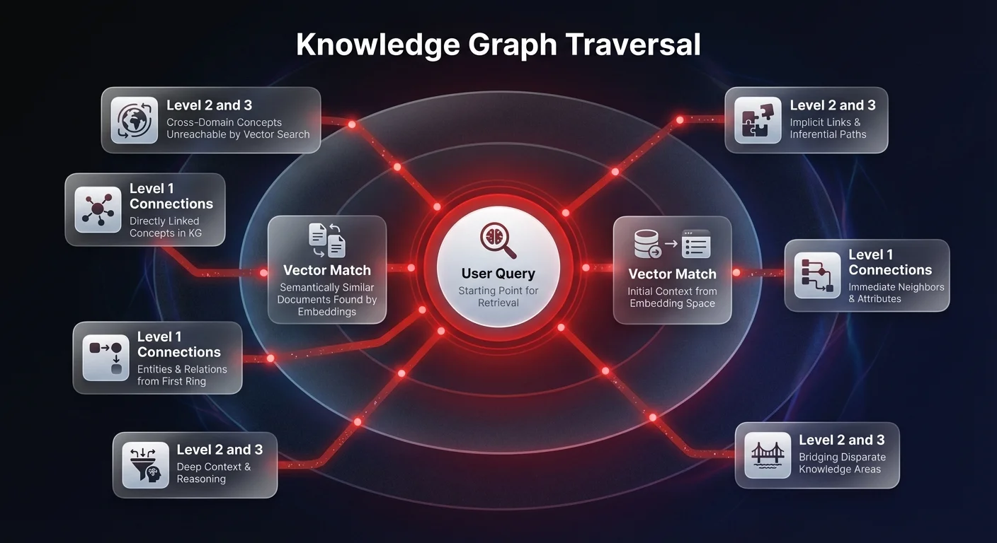 Think of it like a layered cake. The base layer is your semantic match - the raw ingredients found via embeddings. But the layers on top? That's the structural context pulled from the graph. When we query a specific node, we don't just look at its vector neighbors. We traverse the graph to find connected ideas, sometimes three levels deep.