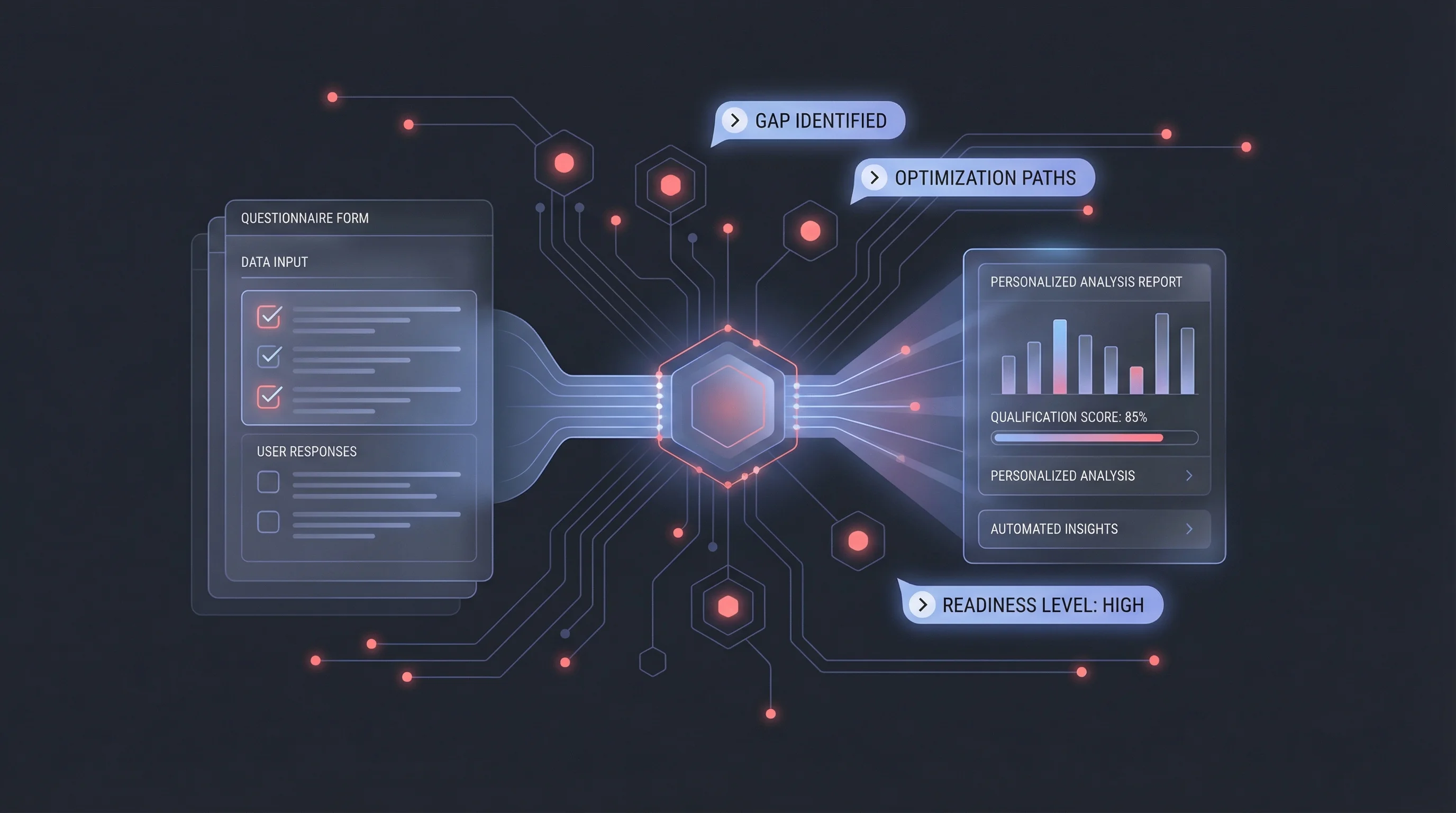 AI-powered assessment analysis. Prospects submit form, AI generates personalized readiness report, delivered within hours - complete with specific recommendations and opportunity identification.